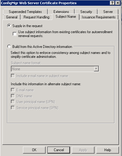 Make sure to use Server 2003, not 2008- In the Properties, name this “ConfigMgr 2012 Client Certificate“.